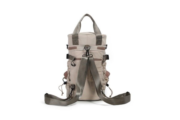 Posee un compartimiento principal y tres bolsillos exteriores; uno frontal y dos laterales. Además, su correa permite que la lleves como bandolera o bien, como mochila.